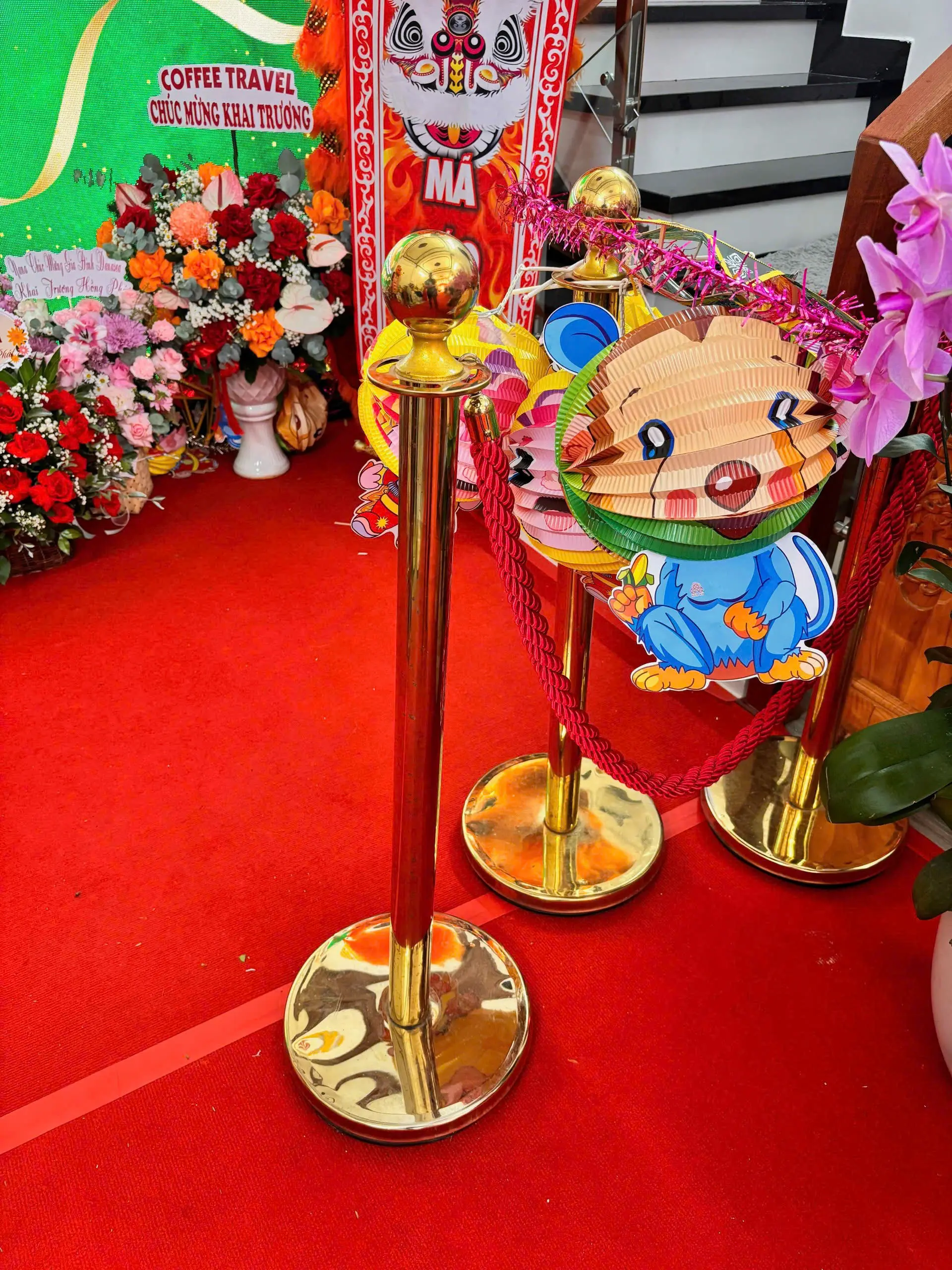 Những cột trụ barrier mạ vàng sáng bóng, kết hợp cùng dây nhung đỏ, không chỉ dùng để phân luồng lối đi. Chúng còn là biểu tượng của sự trân trọng, chào đón nồng nhiệt dành cho khách mời, đối tác, và tạo nên một không gian check-in đẳng cấp.